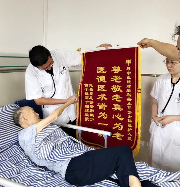8月19日是中國首屆醫(yī)師節(jié),一名再次來我科住院的病人,將一面寫有“尊老敬老真心為老,醫(yī)德醫(yī)術(shù)皆為一流”的錦旗送到醫(yī)護人員手中,感謝醫(yī)護人員在其住院期間給予的無微不至的關(guān)懷和照顧,并由衷地贊美以蔡榮均主任為首的醫(yī)護人員醫(yī)術(shù)精湛,服務(wù)周到。
