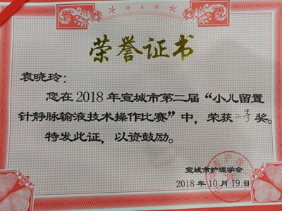 喜訊:我院護士袁曉玲榮獲2018年宣城市“小兒留置針靜脈輸液技術操作比賽”二等獎