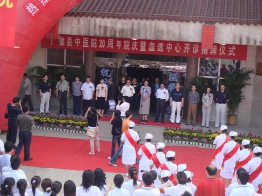 上午9時(shí),在副縣長馬群主持下,廣德縣中醫(yī)院建院二十周年暨血透中心開診系列慶典活動(dòng)在中醫(yī)院隆重開幕。出席儀式的領(lǐng)導(dǎo)和來賓有:安徽省中醫(yī)藥管理局局長董明培、安徽省衛(wèi)生廳婦社處處長沈敏祥、解放軍“九八”醫(yī)院院長高水清、安徽省省立醫(yī)院科教處處長葉山東博士、湖州市婦保院院長沈霞萍、廣德縣政協(xié)主席譚運(yùn)秀、廣德縣委常委政法委書記戴來永、廣德縣人大副主任陶崇林、廣德縣政府副縣長馬群、廣德縣政協(xié)副主席江曉華、廣德縣衛(wèi)生局副局長韓國衛(wèi),以及安徽省中醫(yī)藥管理局、安徽省省立醫(yī)院、解放軍“九八”醫(yī)院、湖州市婦保院等單位的其他領(lǐng)導(dǎo)和來賓們,以及兄弟縣市中醫(yī)院負(fù)責(zé)同志、縣直有關(guān)部門負(fù)責(zé)同志和各鄉(xiāng)、鎮(zhèn)、村醫(yī)護(hù)人員等等。各級(jí)領(lǐng)導(dǎo)親臨慶典現(xiàn)場(chǎng),給中醫(yī)院人以莫大的鼓舞。