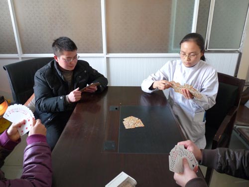 撲克牌采用2副牌,4人對陣打法,三局兩勝淘汰制的比賽方法進行。比賽可謂是緊張激烈,高手如云,大家切磋牌技、互相學習,加強交流,增強了友誼。經(jīng)過六個下午緊張激烈的淘汰賽,最終手術室王海明和吳翠娥獲得了此次比賽的冠軍。