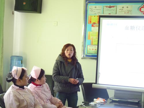 元月14日,醫(yī)院邀請(qǐng)了上海強(qiáng)生公司技術(shù)工程師曹茫茫在醫(yī)院會(huì)議室舉行了血糖監(jiān)測(cè)的業(yè)務(wù)學(xué)習(xí)講座,主題為“精確測(cè)試,安全使用”。工程師從臨床到實(shí)驗(yàn)室等各方面深入淺出地做了血糖監(jiān)測(cè)的詳細(xì)講解,并進(jìn)行了正確監(jiān)測(cè)血糖的現(xiàn)場(chǎng)演示。