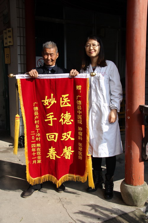 近日,我院腫瘤科張琴醫(yī)生收到病人贈(zèng)予的錦旗一面,上書“醫(yī)德雙馨,妙手回春”八個(gè)大字。據(jù)悉,送錦旗的熊大爺是盧村鄉(xiāng)丁沖村人,今年年初被查出患有食道癌,曾輾轉(zhuǎn)湖州等地求醫(yī)。后到我院腫瘤科求醫(yī),張琴醫(yī)師根據(jù)熊大爺?shù)牟∏,量身為他制定了中藥加化療相結(jié)合的方案,如今熊大爺已經(jīng)基本康復(fù)。接受采訪時(shí),熊大爺說,現(xiàn)在他對張琴醫(yī)師特別信賴,對以后的康復(fù)也很有信心,并表示回鄉(xiāng)后一定要告訴大伙中醫(yī)院有一位好醫(yī)生。愊/圖、文)