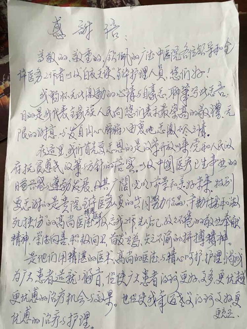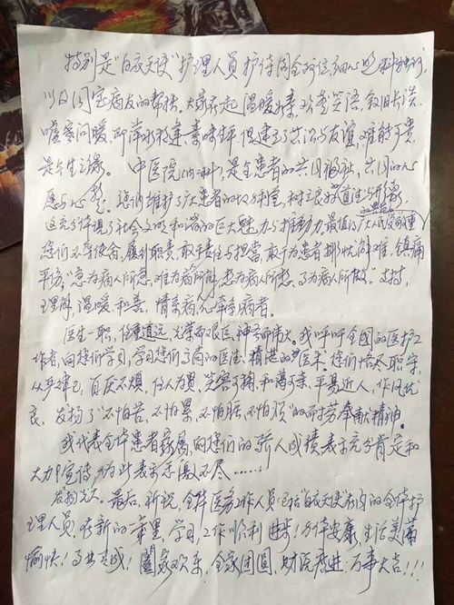 12月12日,家住新杭鎮(zhèn)金雞籠村的王運(yùn)興老人因突感胸悶、腹?jié)q,被家人送往縣中醫(yī)院就診。經(jīng)檢查,老人患肺炎及肝硬化伴腹水。王運(yùn)興老人在該院內(nèi)二科接受治療期間,切身感受到了該科醫(yī)護(hù)人員對患者無微不至的關(guān)心和周到滿意的服務(wù),因此特地給醫(yī)院寫了一封感謝信,信中字里行間包含了病人對全體醫(yī)護(hù)人員的感激之情。