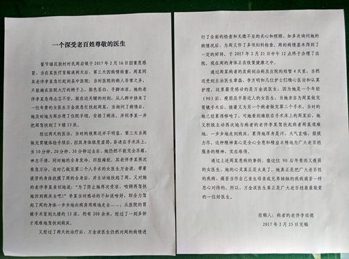 “今天我是特意來(lái)感謝縣中醫(yī)院脾胃科的萬(wàn)金波醫(yī)生的,感謝她在我老伴住院期間無(wú)微不至的關(guān)懷!3月1日,家住誓節(jié)鎮(zhèn)花鼓村的李祖德老人找到記者,希望宣傳一下萬(wàn)金波醫(yī)生的醫(yī)者仁心。