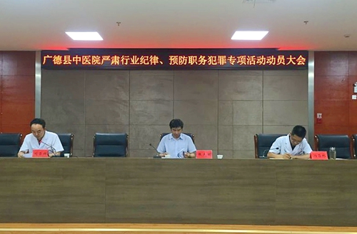 為進(jìn)一步加強(qiáng)醫(yī)療行風(fēng)建設(shè),預(yù)防職務(wù)犯罪。5月26日下午,廣德縣中醫(yī)院在六樓會(huì)議室召開(kāi)“嚴(yán)肅行業(yè)紀(jì)律·預(yù)防職務(wù)犯罪”專項(xiàng)活動(dòng)動(dòng)員大會(huì)。縣衛(wèi)計(jì)委黨委委員張先明,院領(lǐng)導(dǎo)班子成員、各科室負(fù)責(zé)人及醫(yī)護(hù)人員200余人參加會(huì)議。會(huì)議由副院長(zhǎng)、紀(jì)檢組長(zhǎng)劉榮祥主持。