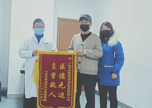 今天一大早,周先生帶著妻子,熟絡(luò)的按響了ICU的門鈴,給我們帶來了一面感激的錦旗。錦旗上書:醫(yī)德無邊,負(fù)重救人。他說,他回河南老家,去醫(yī)院拆舌頭上的縫合線時,醫(yī)生告訴他,是我們救了他一命,他非常感激,感謝我們的救命之恩。