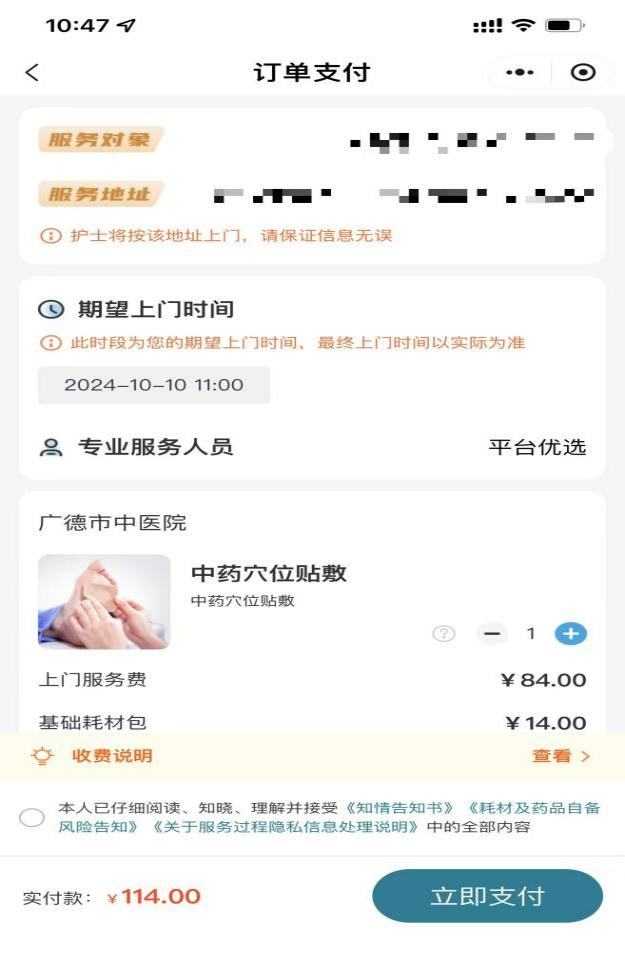 第五步,支付后,我們專業(yè)的護(hù)理團(tuán)隊(duì)將迅速響應(yīng),按時(shí)到達(dá)您的家中,以專業(yè)、貼心的服務(wù)為您解決護(hù)理難題