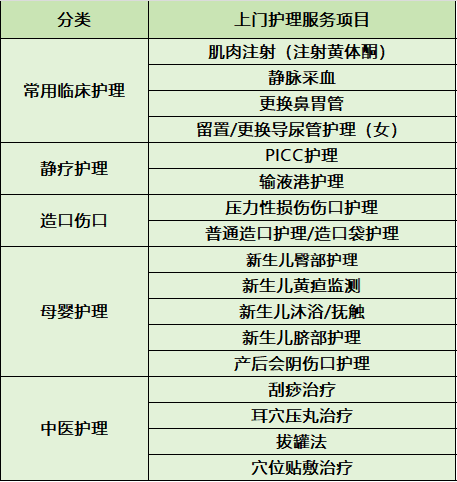 從即日起,我們可以派遣專業(yè)的護(hù)理人員上門提供肌肉注射、更換鼻胃管、更換導(dǎo)尿管、拔火罐、母嬰護(hù)理等 17 項(xiàng)上門護(hù)理服務(wù)。