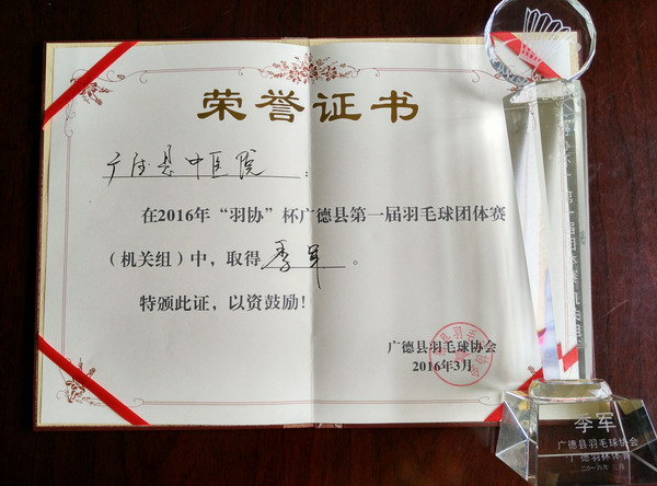 3月19日,2016年“羽協(xié)杯”廣德縣第一屆羽毛球團(tuán)體賽(機(jī)關(guān)組)舉行。我院代表隊(duì)團(tuán)結(jié)協(xié)作,不畏強(qiáng)手,最終勇奪本屆比賽季軍。好成績也展示了中醫(yī)院良好的團(tuán)隊(duì)精神,隊(duì)員們紛紛表示,在今后的比賽中,會再接再厲,頑強(qiáng)拼搏,再創(chuàng)佳績。(陳希/圖、文)