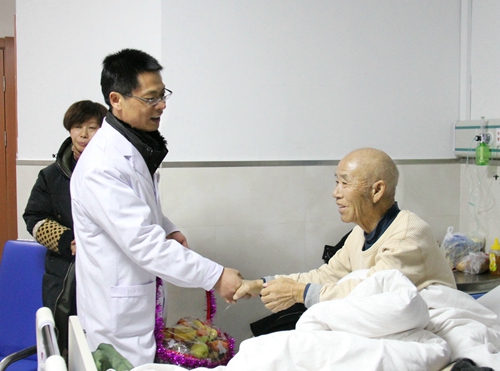 “過年好,大家辛苦了!”每到一處,院領(lǐng)導(dǎo)都熱情的與值班人員一一握手,感謝他們?cè)诔χ鼓軌蛏嵝〖、顧大家,為醫(yī)院和病人無私奉獻(xiàn)、辛勤工作。院領(lǐng)導(dǎo)囑咐大家在繁忙的工作中注意休息,并希望各科室值班人員,要認(rèn)真堅(jiān)守崗位,做好交接班工作,保證患者正常治療,確保環(huán)境安全和醫(yī)療安全。院領(lǐng)導(dǎo)的親切關(guān)懷使大家深受鼓舞,值班人員紛紛表示將牢記院領(lǐng)導(dǎo)的囑托,保質(zhì)保量的做好各項(xiàng)工作,竭盡全力為患者健康保駕護(hù)航。同時(shí),院領(lǐng)導(dǎo)班子一行到病房看望了住院病人及家屬,為病人送去了果籃,游院長親切地與病人及家屬進(jìn)行交談,關(guān)切地了解病人的困難,仔細(xì)詢問患者的病情和恢復(fù)情況,鼓勵(lì)病人一定要注意休息,安心在院治病。